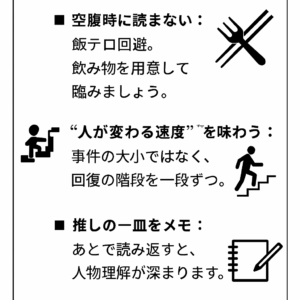 - “人が変わる速度”を味わう:事件の大小ではなく、回復の階段を一段ずつ。