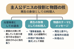 デニスは冒険から身を引き、「冒険者食堂」を開業。ここは単なる飲食店ではなく、居場所を失った者たちが再び立ち上がるための場所として描かれます。料理は栄養ではなく“再出発の儀式”として機能しており、彼の温かさが周囲を変えていきます。
