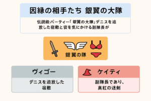 デニスが所属していた伝説級パーティー「銀翼の大隊」。彼を追放した宿敵と、いまも彼を気にかける副隊長が、物語に緊張と厚みを与えます。