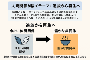 登場人物たちは、それぞれ“追放”や“挫折”を経験しています。しかし、デニスの料理と温かい空間を通じて、再び人生を取り戻していく。