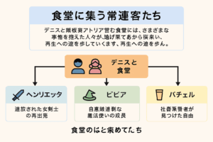 デニスと看板娘アトリエが営む食堂には、さまざまな事情を抱えた人々が訪れます。彼らは皆、追放・挫折・過労といった現代的テーマを背負い、再生への道を歩んでいきます。