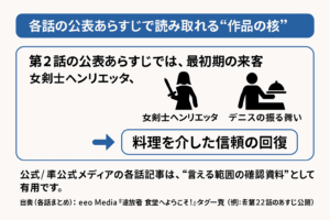 第2話の公開あらすじでは、最初期の来客(女剣士ヘンリエッタ)や、デニスの振る舞いが描かれ、「料理を介した信頼の回復」という作品の核が前景化していることが分かります。公式/準公式メディアの各話記事は、“言える範囲の確認資料”として有用です。