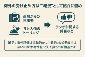- 海外反応は概況紹介に留め、断定的評価は避ける。